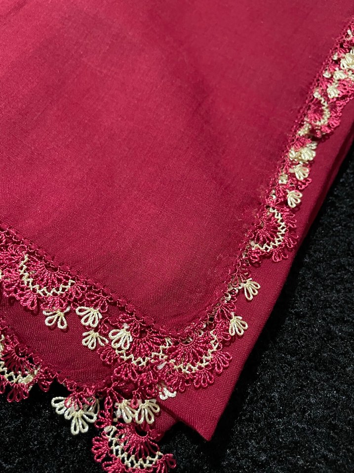 Yumuşak dokulu, bordo renkli, dantel kenar detaylı konvansiyonel kadın eşarp .El yapımıdır sorunsuzdur
