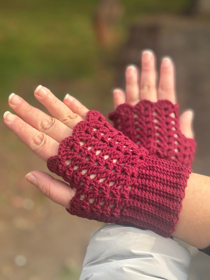 Bordo renkli, dantel detaylı örgü eldivenler. Parmaksız tasarımıyla bohem, retro ve rahat bir görünüm sunar.