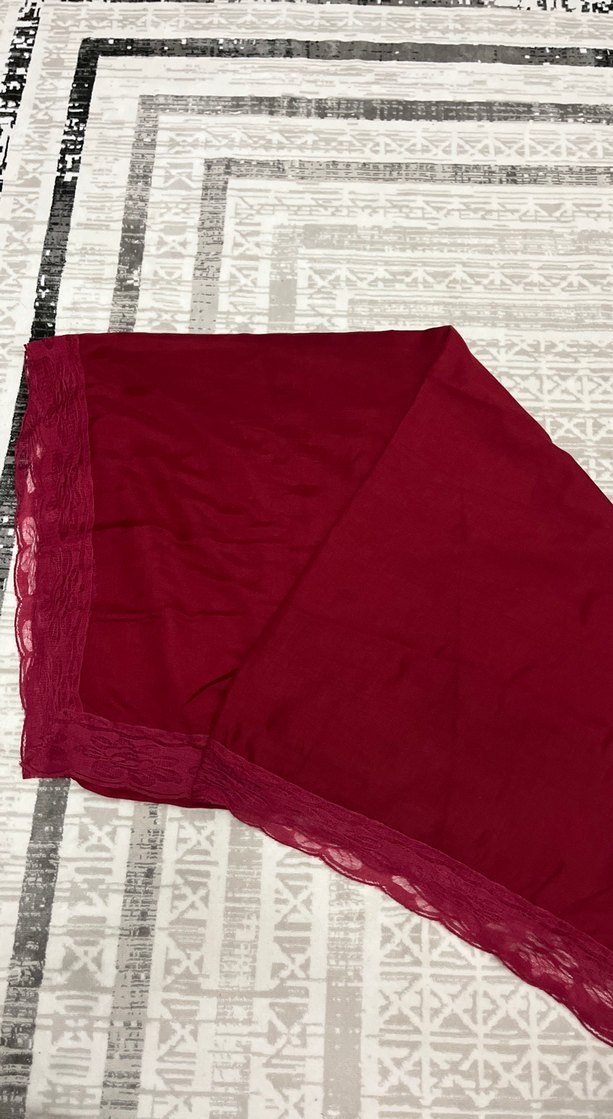 Bordo renkli, yumuşak sentetik kumaştan yapılmış, dantel detaylı kadın şalı, sade bohem tarzını yansıtıyor.