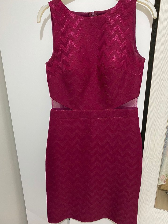 Bordo renk, dantel ve nakış detaylı, kolsuz, V yakalı, dar kesim kısa abiye elbise. Parlak dokusuyla şık ve modern bir tasarım sunar. ✨