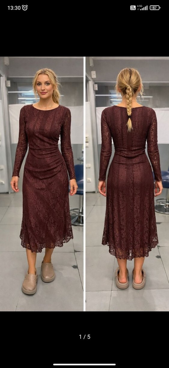 Bordo renkte, uzun kollu, tek parça dantel detaylı, midi kesim ve tekne yaka elbisedir. Ofis kullanımı için uygun, klasik şıklık sunar.