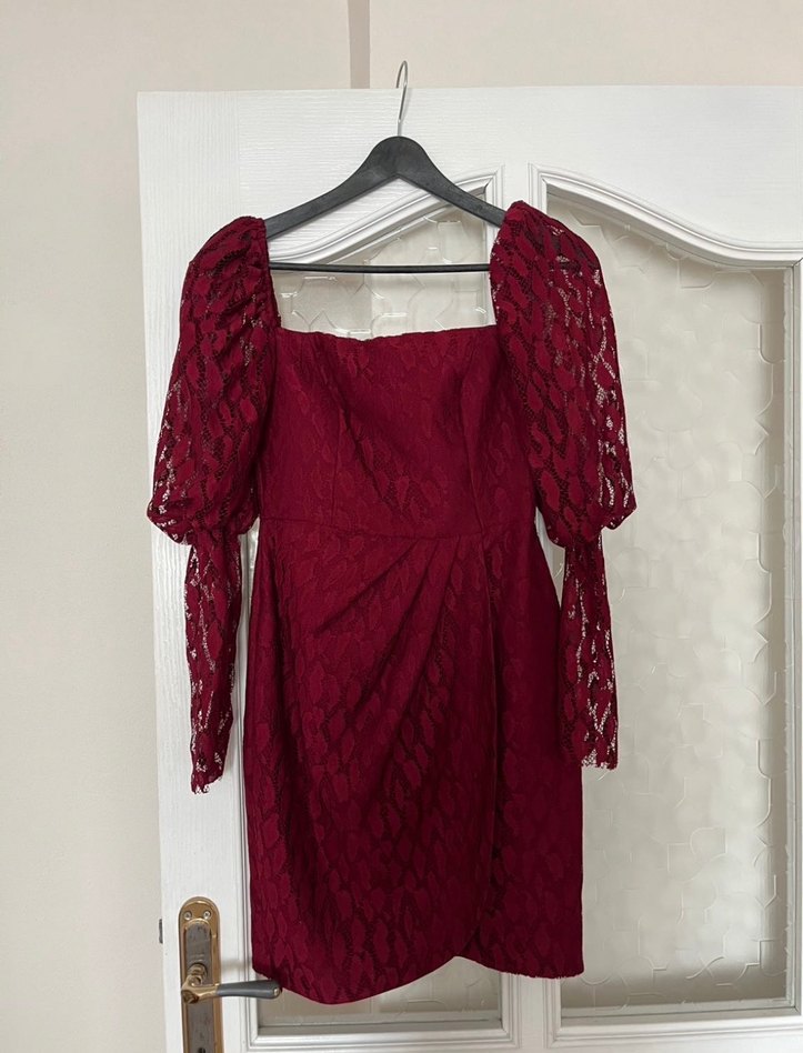 Bordo renkli, dantel kumaştan yapılmış, kare yaka ve uzun balon kollu, modern klasik tarzda, vücuda oturan midi elbise. Romantik akşamlar için ideal. Sadece bir kez giyildi.