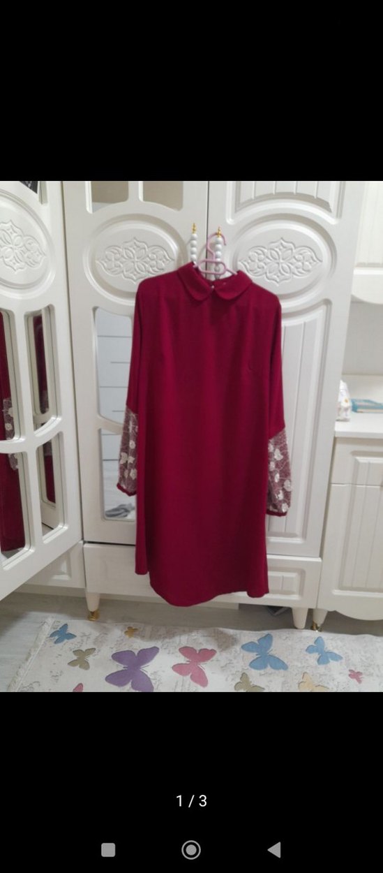 Bordo renkli, dantel detaylı ve nakışlı desenlere sahip midi uzunlukta tunik. Uzun kollu, yüksek yakalı ve bol kesimdir. Parlak sentetik kumaştan yapılmıştır, modern klasik tarz sunar.