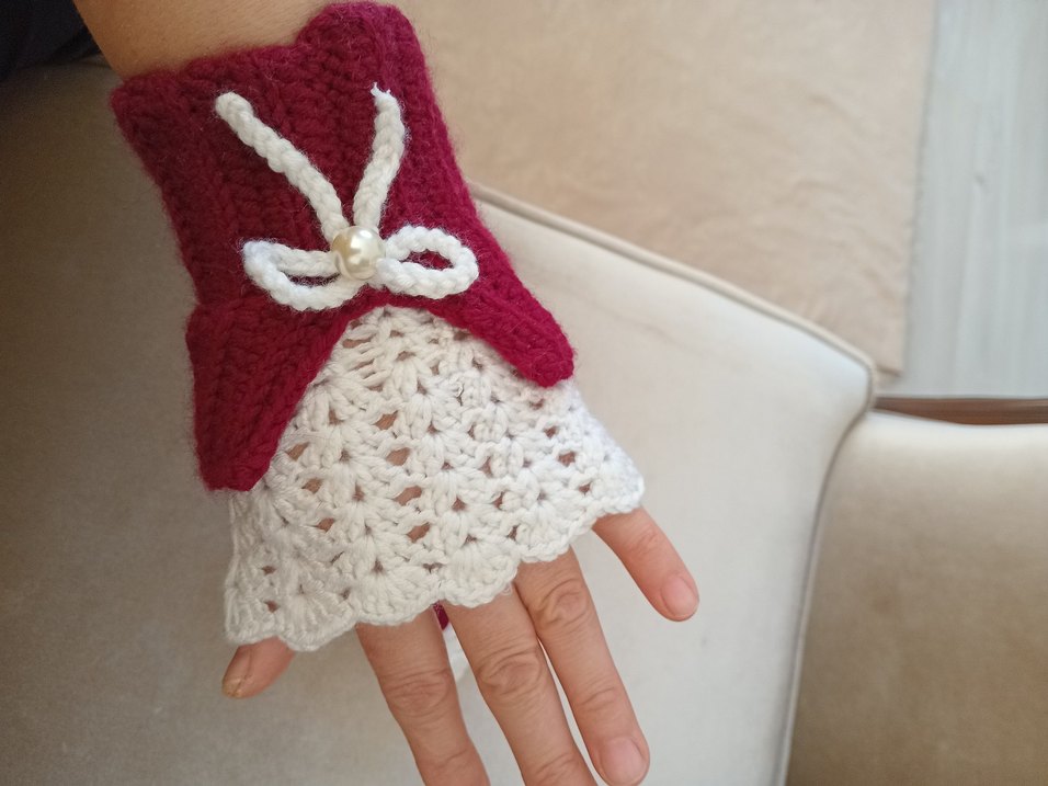 Beyaz dantel ve inci detaylı bordo örgü kadın eldiveni, rahat ve bohem tarz sunar.