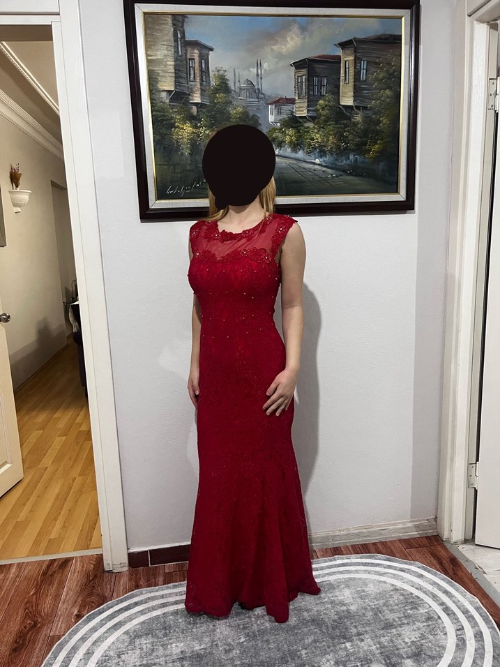 Bordo renkli, dantel detaylı, V yakalı ve kolsuz, klasik şıklıkta uzun abiye elbise. S beden fakat kalıbı esnek olduğundan m de olur