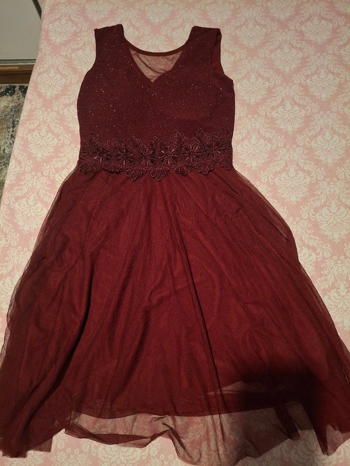 Bordo renkli, uzun ve vücuda oturan bu abiye elbise V yakalı ve kolsuzdur. Belinde dantel detayları bulunur, klasik ve zarif bir görünüme sahiptir. Düğünler ve şık davetler için uygundur.