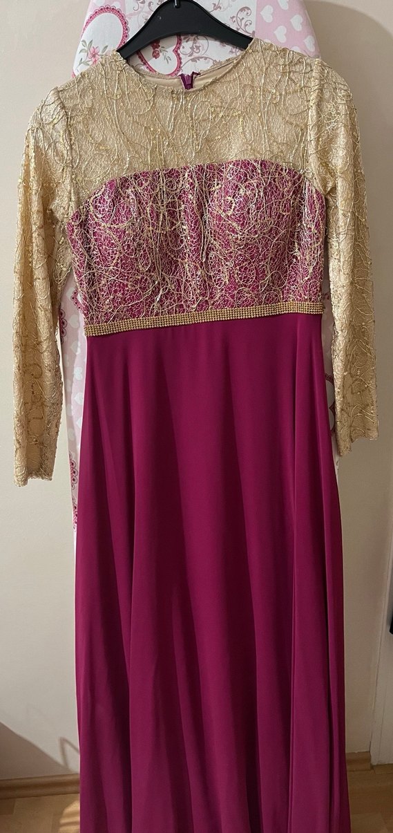 Büstiyer ve uzun kollarında parlak işlemeli dantel detayları bulunan, straplez yakalı ve vücuda oturan bordo uzun abiye elbise.