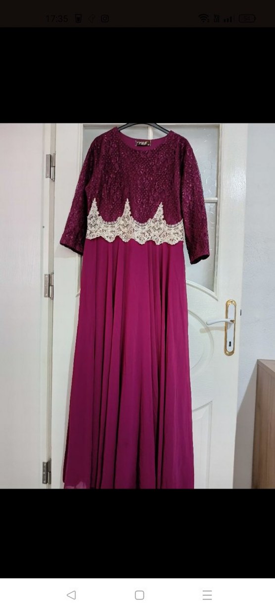 Uzun kollu, tekne yaka ve dantel işlemeli bordo abiye elbise, bol kesim etekli, düğünler için uygun.
