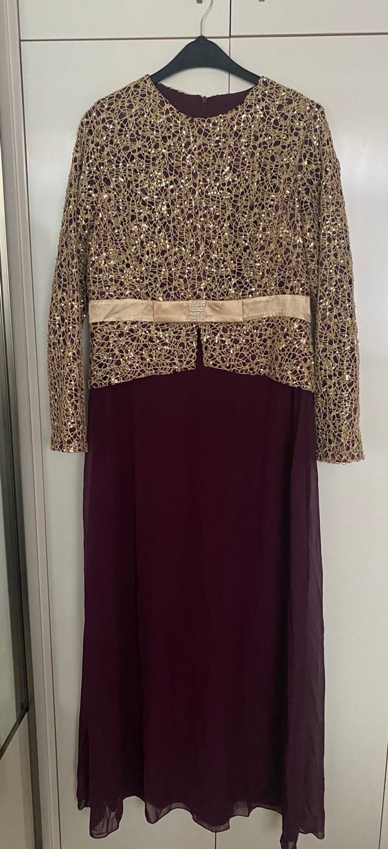 Bordo renginde, uzun kollu ve dantel detaylı bu uzun abiye elbise, klasik ve vintage tarzıyla düğünler için uygundur.