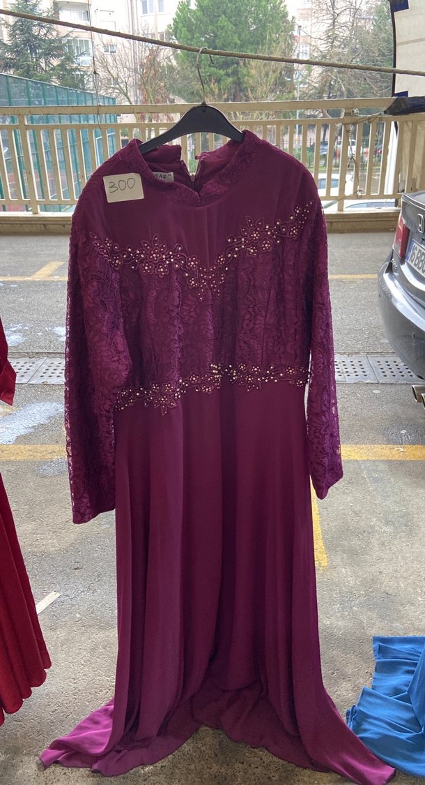 Bordo renkli, dantel detaylı ve yüksek yakalı uzun abiye elbise. Uzun kollu ve salaş kesim, vintage tarzda düğünler için uygun.