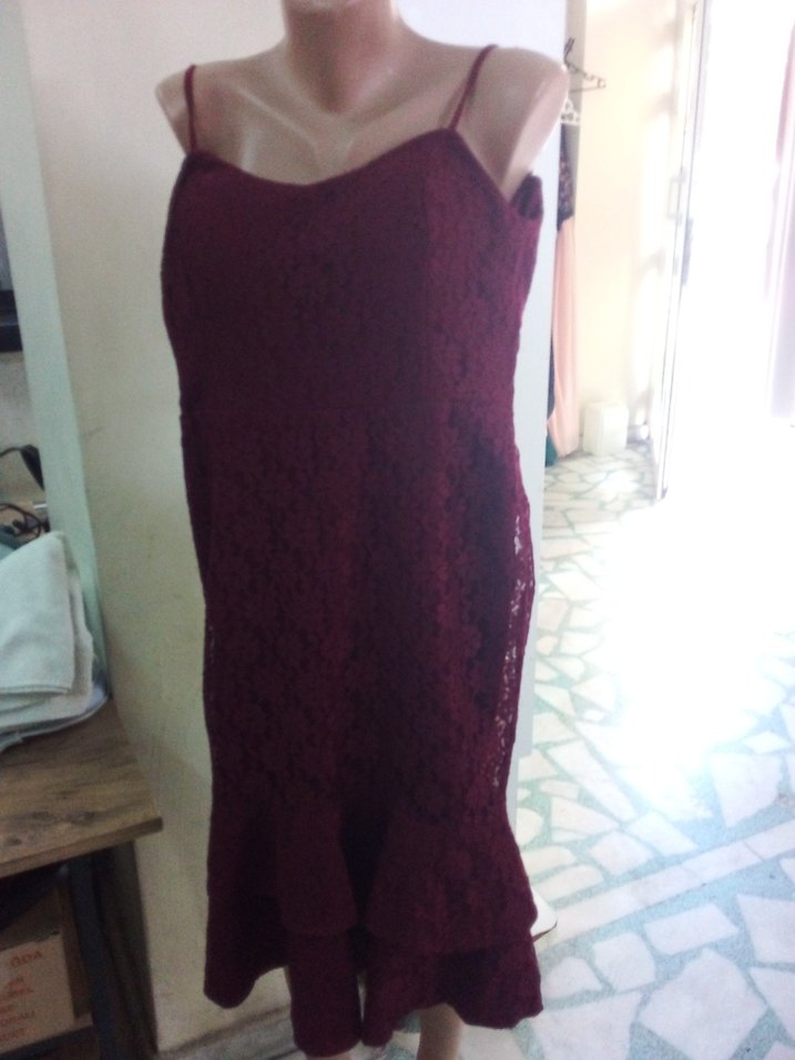 Bordo renkte, dantel detaylı, V yaka, kolsuz ve uzun boyda kadın abiye elbise. Sıkı kesimi ile minimalist gotik tarzda cesur bir görünüm sunar.