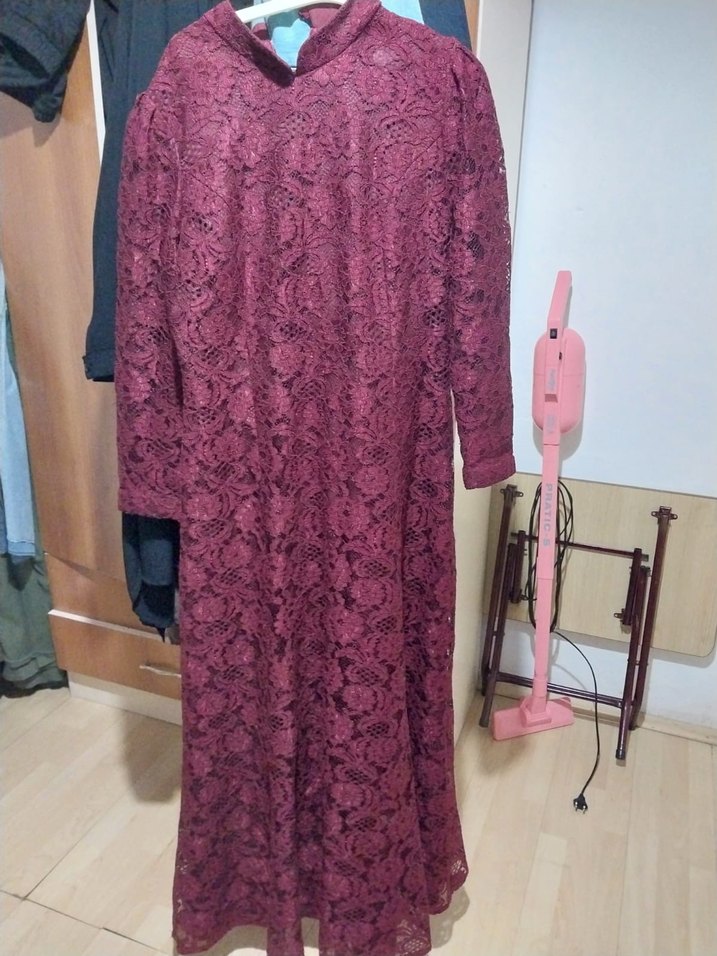 Bordo renkli, dantel desenli, uzun kollu ve yüksek yakalı, vücuda oturan vintage tarzda uzun elbise. İki kere giyildi.