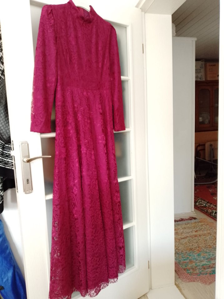 1 sefer kullanıldı asla sorunu yokturBordo renkli dantel detaylı, uzun kollu ve yüksek yakalı, klasik ve modern tarzda, düğünler için uygun uzun elbise.