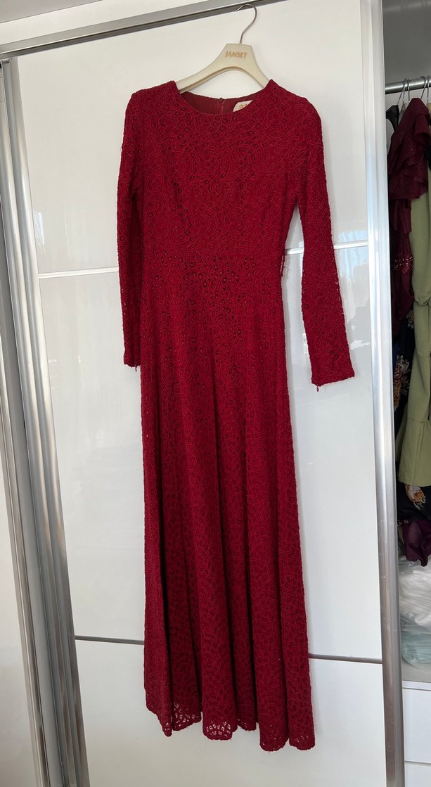 Bordo dantel kumaştan, uzun kollu ve V yaka detaylı, klasik kesim uzun elbise. Düğün için uygun şık parça.