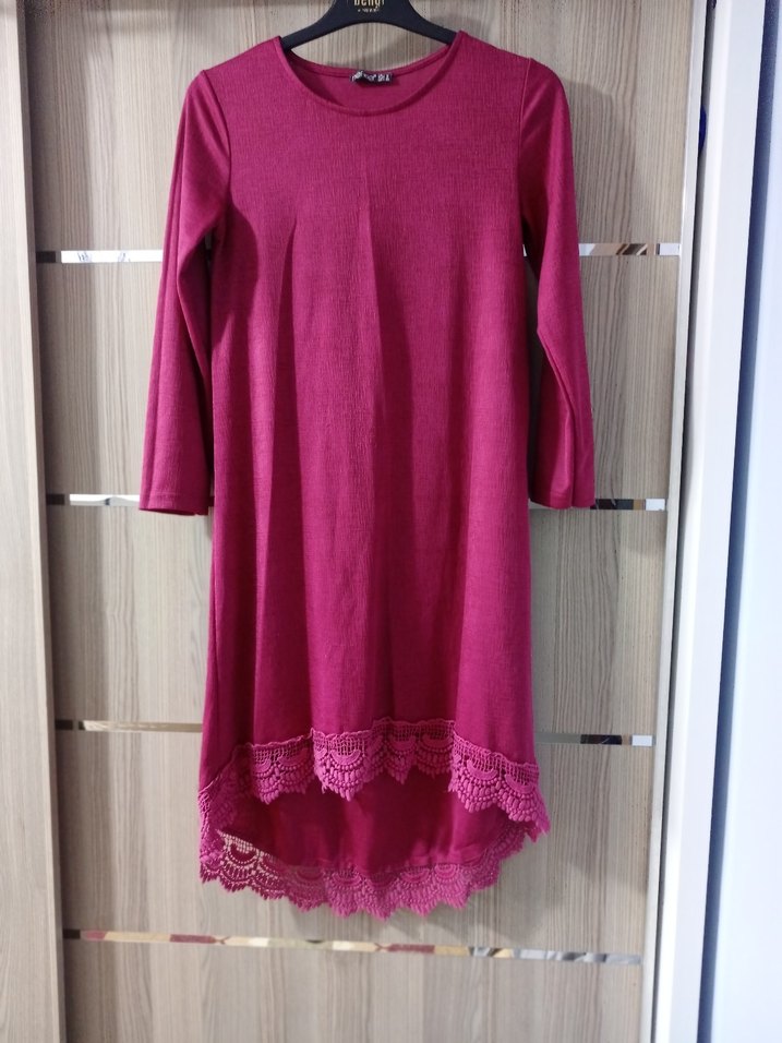 Bordo renkli, uzun kollu, yuvarlak yakalı tunik. Alt kısmında dantel detayları bulunan, bol kesim ve bohem tarzda günlük kullanıma uygun.