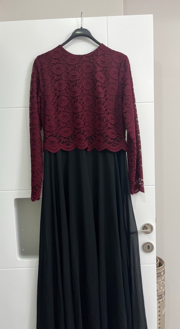 Bordo dantel üst kısmı, uzun kollu ve bol kesimli, siyah uzun etekli uzun gece elbisesi. Yuvarlak yakalı, klasik ve gotik tarzı bir arada sunar. Ofis için uygundur.