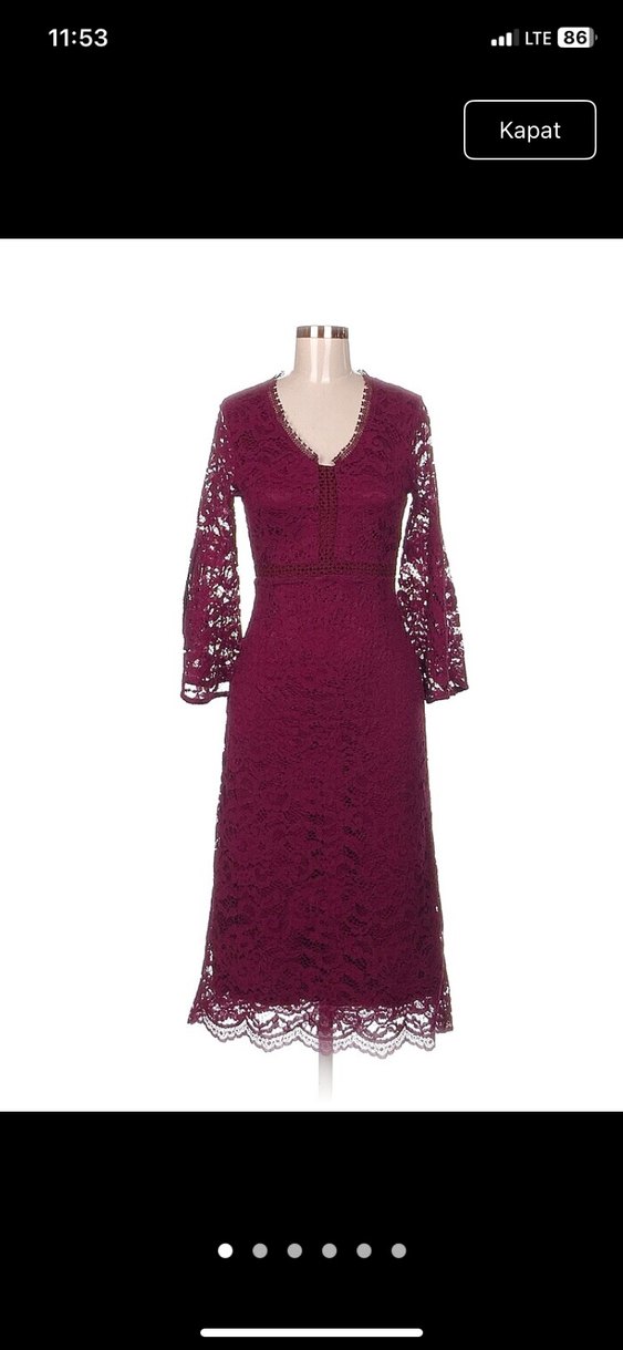 Bordo renkli, dantel kumaştan, uzun kollu ve V yakalı bu uzun elbise, vintage bohem tarzıyla romantik akşamlara uygun şık bir seçimdir.