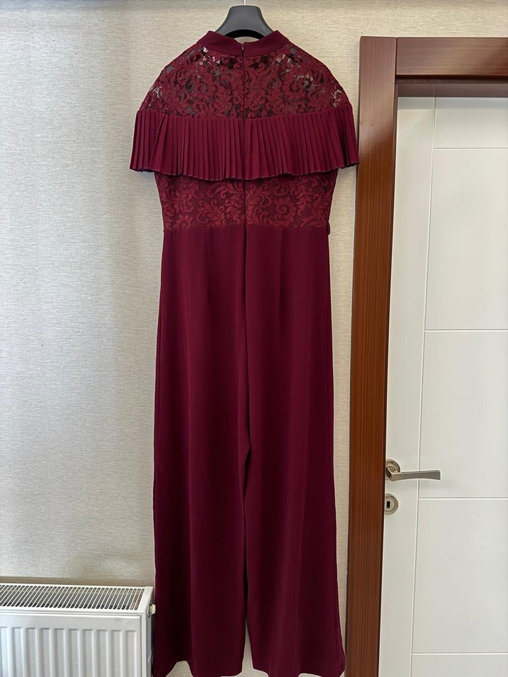 Bordo renk, dantel detaylı, yüksek yakalı ve askılı kollu uzun tulum. Gotik ve bohem tarzı bir arada sunan, romantik akşamlar için uygun şık parça.
