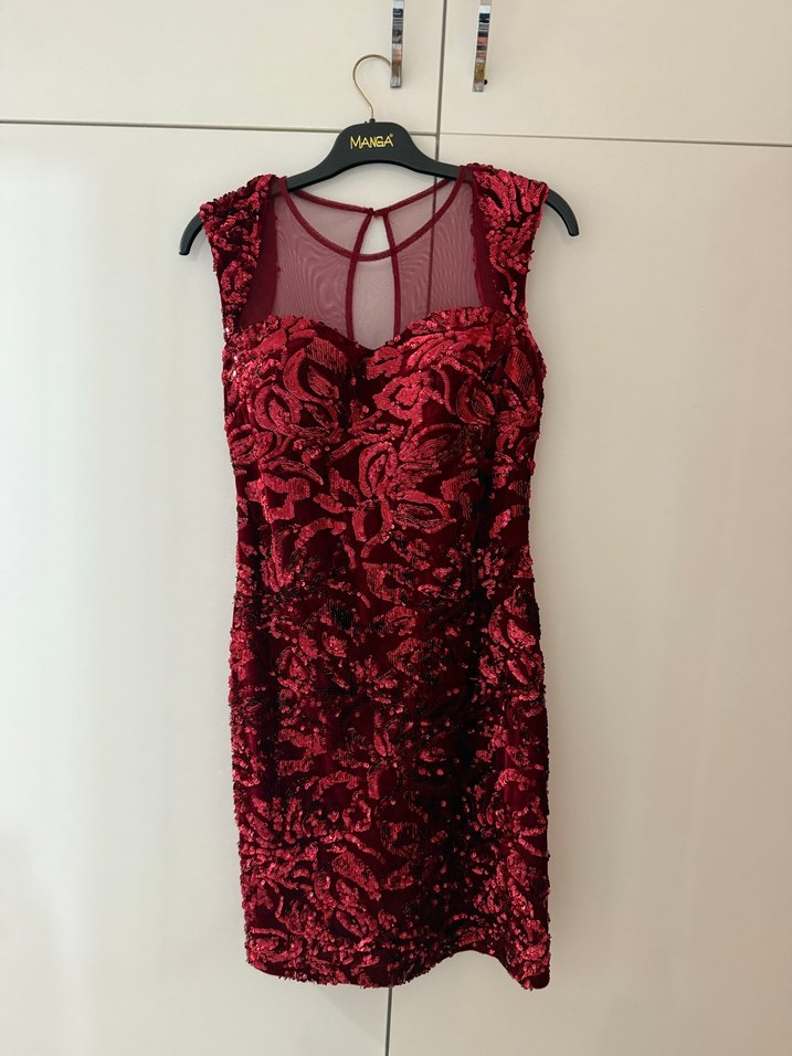 Bordo renkli, dantel desenli, V yaka, kolsuz ve vücuda oturan midi elbise. Modern klasik tarzda, romantik akşamlar için ideal.