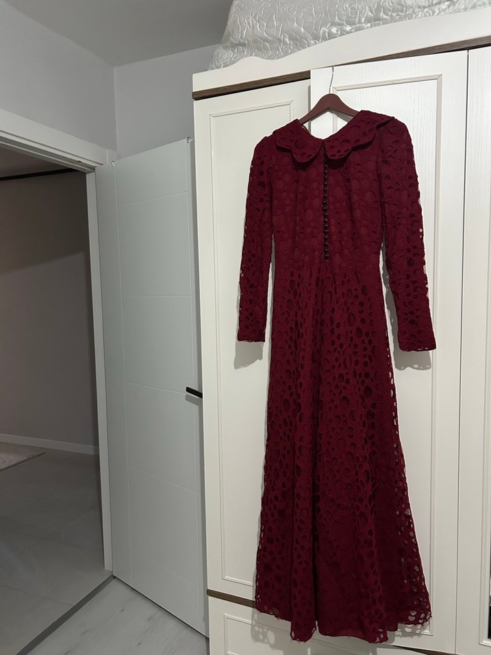 Bordo renk, uzun kollu, işlemeli dantel kumaştan yapılmış, yakası kesimli ve vücuda oturan vintage tarzda uzun elbise.