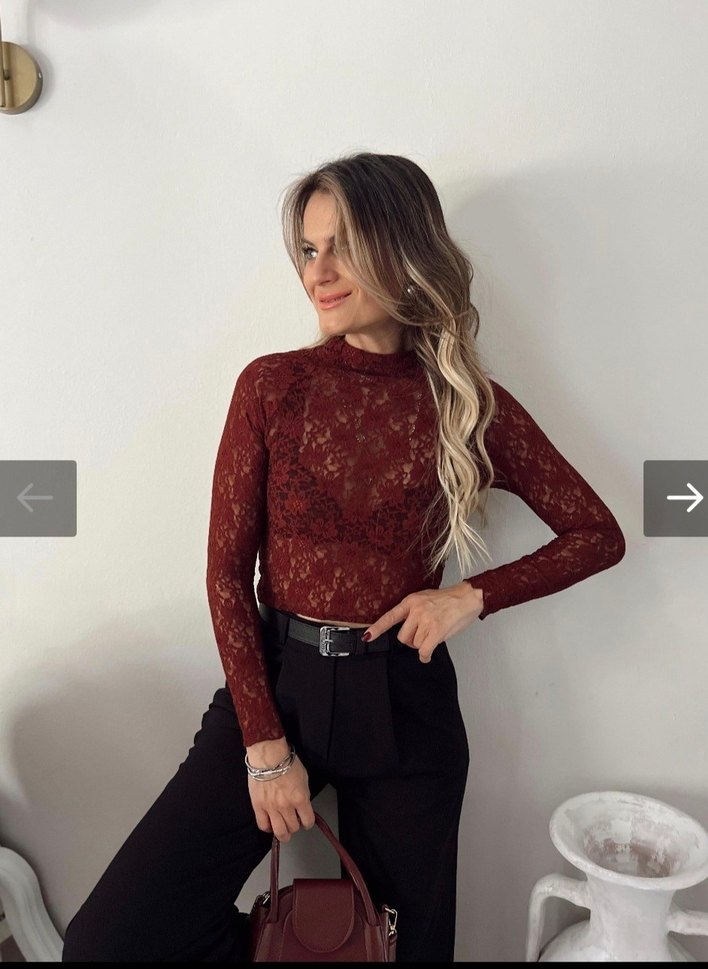 Bordo renkli, dantel detaylı uzun kollu ve yüksek yakalı, ince kesim bluz. Ofis için uygun, sokak stiline uygun tarzda.