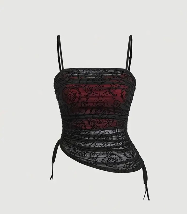 Bordo renkte, işlemeli dantel detaylı, askılı ve straplez yaka tasarımlı, sentetik kumaştan yapılmış, vücuda oturan gotik bustiyer.