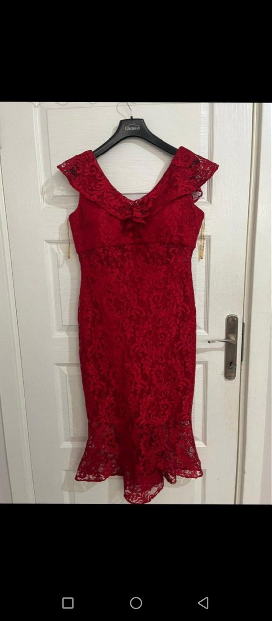 Bordo renkli, işlemeli dantel detaylı, V yaka ve kolsuz tasarıma sahip, vintage ve modern klasik tarzda, düğünler için uygun dar kesim midi elbise.
