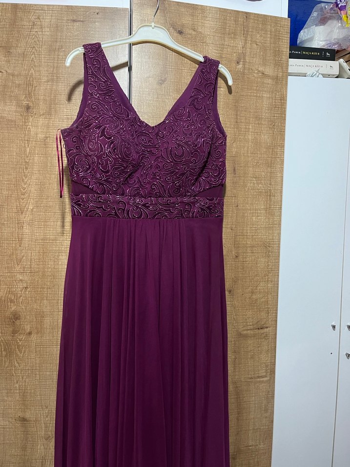 Bordo renkli, V yakalı ve kolsuz, dantel işlemeli üst kısmı ile klasik kesim uzun abiye elbise. Düğünler için uygun şık bir seçim. Büyük beden