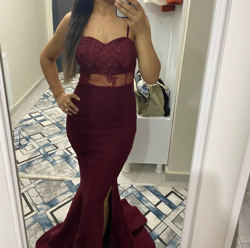 Bordo renk, dantel işlemeli, straplez ve askılı uzun abiye elbise. Fitted kesimi ve yırtmaç detayıyla romantik geceler için uygun. 1 kere giyildi