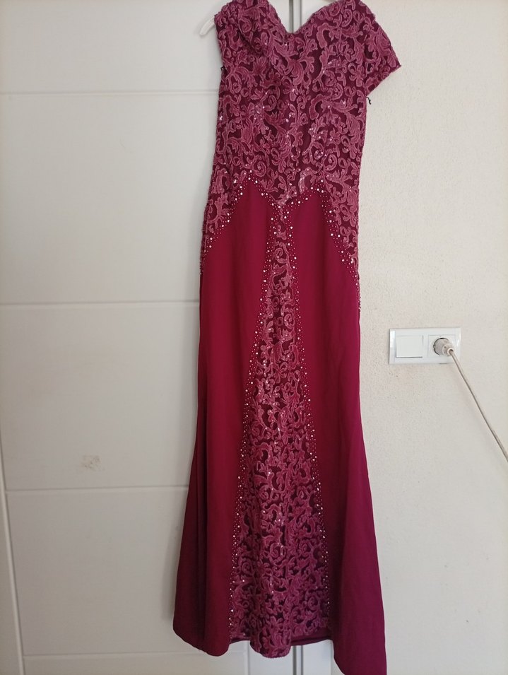 Bordo renkte, dantel ve işlemeli detaylara sahip, straplez yaka ve kolsuz uzun abiye elbise. Düğün ve özel davetler için uygun, klasik ve şık bir modeldir.