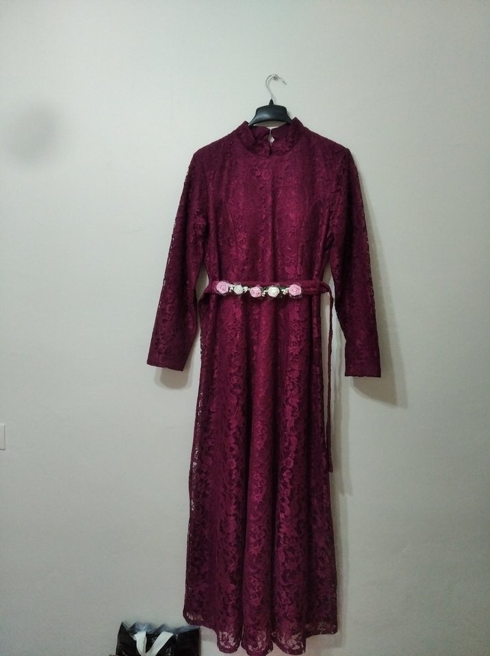 Bordo renkli, işlemeli dantel kumaştan yapılmış, yüksek yakalı ve uzun kollu, vintage bohem tarzda, çiçekli kemer detaylı, düğün için uygun dar kesim uzun elbise.