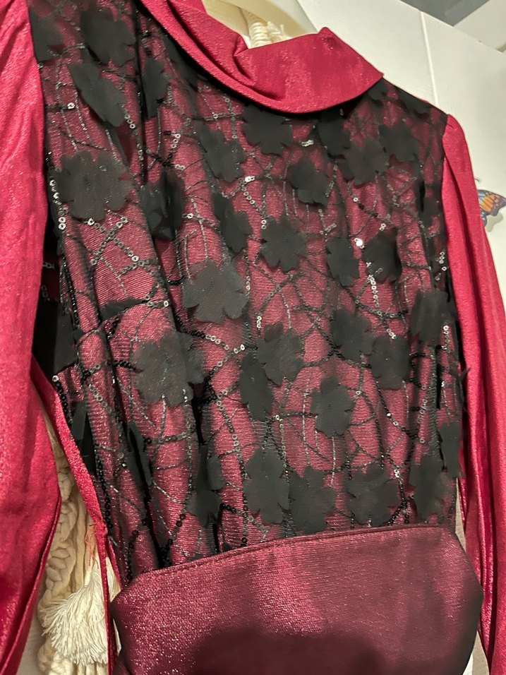 Bordo renkli, yüksek yakalı ve uzun kollu bu dar kesim elbise, siyah işlemeli dantel detaylarıyla gotik tarzda tasarlanmıştır. Parti için uygundur.