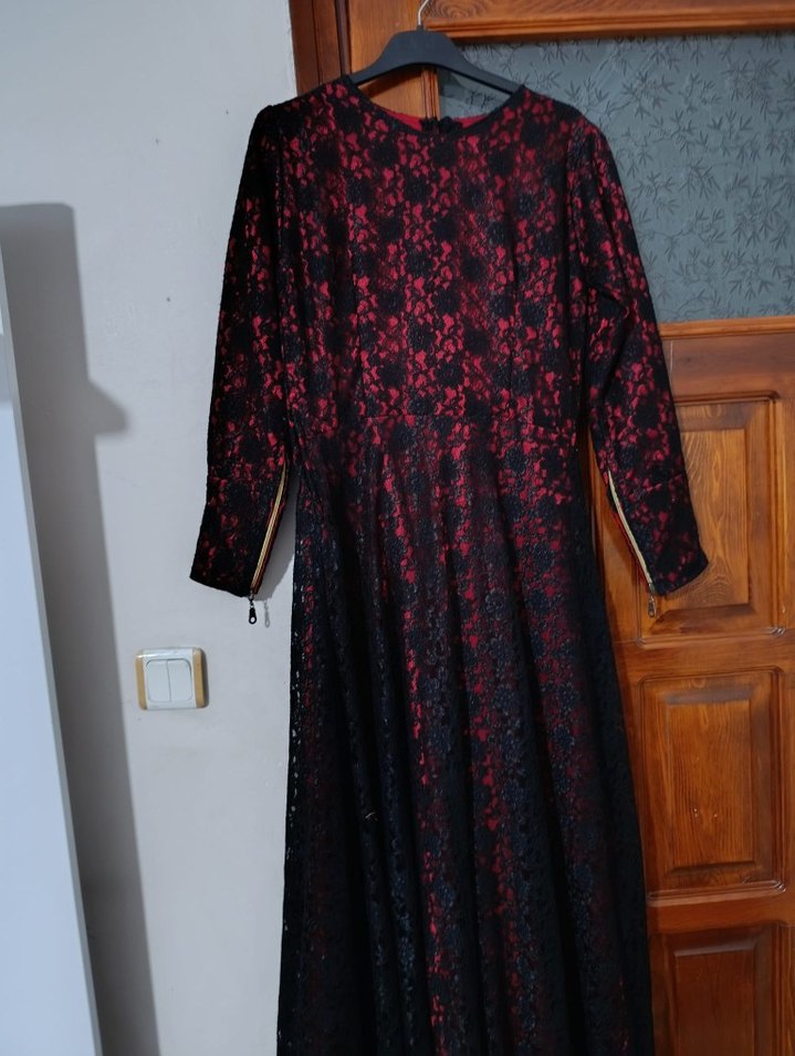 Bordo renkli, işlemeli ve siyah dantel kaplamalı uzun kollu, V yakalı, bol kesim uzun elbisedir. Klasik gotik şıklık için uygundur.