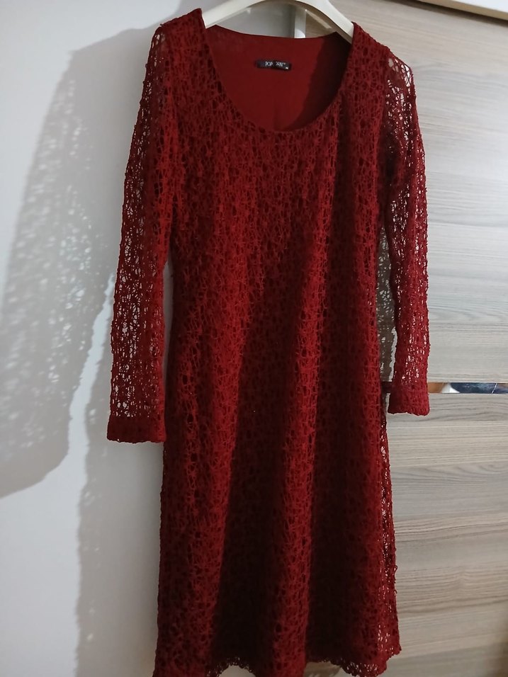 Bordo renkte, uzun kollu, yuvarlak yakalı, dantel kumaştan yapılmış, bohem tarzda, vücuda oturan midi elbise. Romantik akşamlar için uygundur.