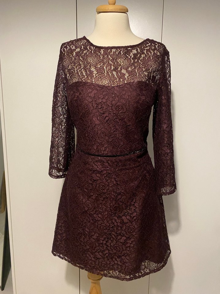 Bordo dantel kumaştan, tek renk, tek parça, midi uzunlukta, uzun kollu, tekne yaka, vintage tarzında klasik ve gotik kesim elbise. TAKASA AÇIK ✅ Koton Dilek Hanife elbisesi Sorunsuzdur yeni ve etiketlidir. Herhangi bir sorunu yoktur. 24 saat içerisinde kargoya verilecektir.