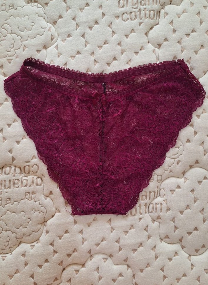 Bordo renkte, bohem tarzda dantel kumaştan yapılmış normal boy midi kadın külot. 'Cottor' işareti pamuk içeriğine işaret eder.