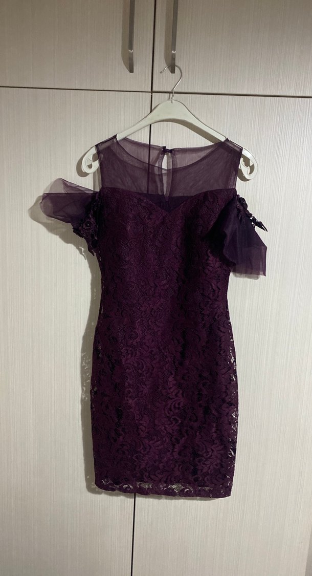 Bordo renkte, dantel detaylı, straplez ve şeffaf omuzlu, klasik zarafet taşıyan gothic tarzda, midi boy, vücuda oturan gece elbisesi.