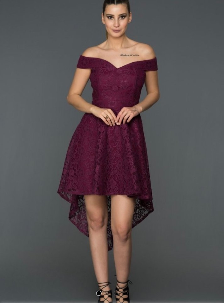 Bordo dantelli mini kokteyl elbisesi, straplez ve omuzları açık askılar ile. Gevşek kesimi, gotik tarzı ve uzun arka etek ucu romantik akşamlar için uygun.