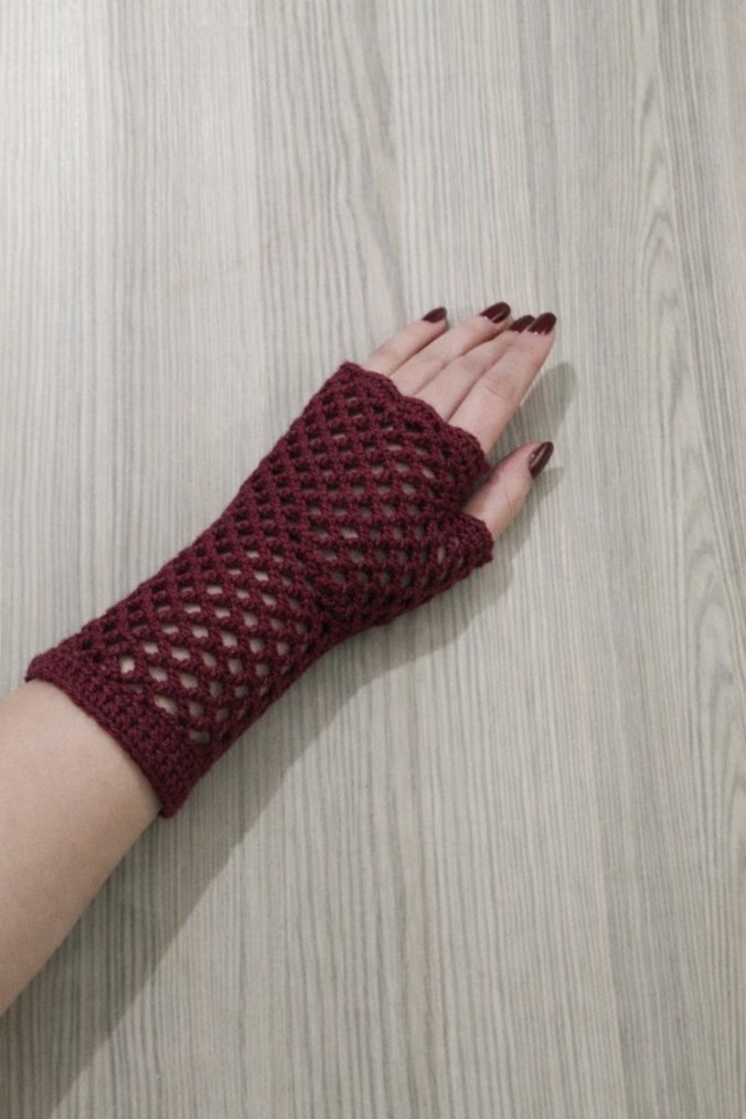 Bordo renkli, dantel detaylı ve örgü desenli kadın eldiveni, rahat ve renkli bohem stil sunar.