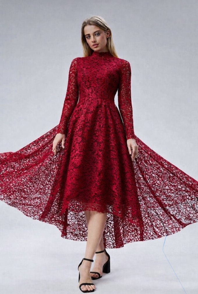 Bordo renkte, uzun kollu ve yüksek yakalı dantel detaylı, klasik ve şık gotik tarzda uzun abiye elbise. Düğünler için uygundur.