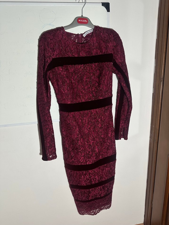 Bordo renkli, dantel detaylı, uzun kollu, desenli ve kadife şeritli dar kesim abiye elbisedir. Trendyol x tuvanam