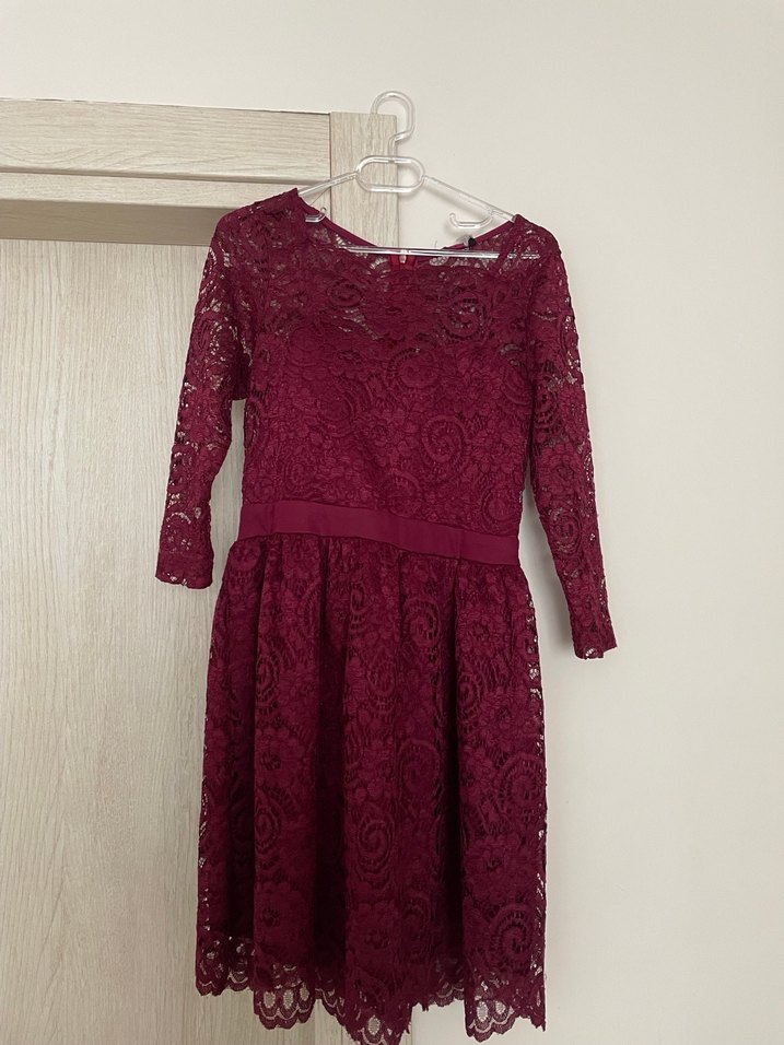 Bordo renkli, dantel detaylı, uzun kollu ve klasik kesim midi elbise, şık davetler için ideal.