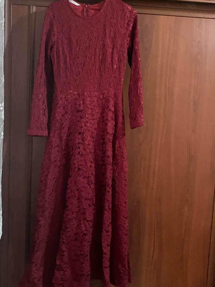 Bordo Dantel Uzun Kollu Tesettüre Uygun Elbise