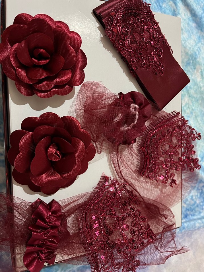 Bordo renkte dantel detaylı, çiçek ve tül öğeleri içeren vintage bohem tarzda gelin aksesuarları.