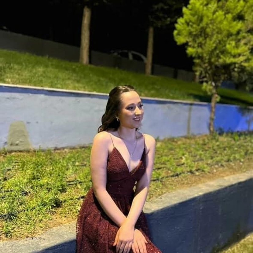 Bordo renk, dantelli ve parlak kumaştan yapılmış, V yakalı, askılı, uzun ve vücuda oturan bir elbisedir. Cesur ve gösterişli tarzı yansıtır.