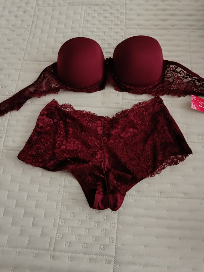 Bordo renkte, kısa boyda ve bohem tarzda dantel detaylı sütyen ve kısa şort takımıdır. Beden 80