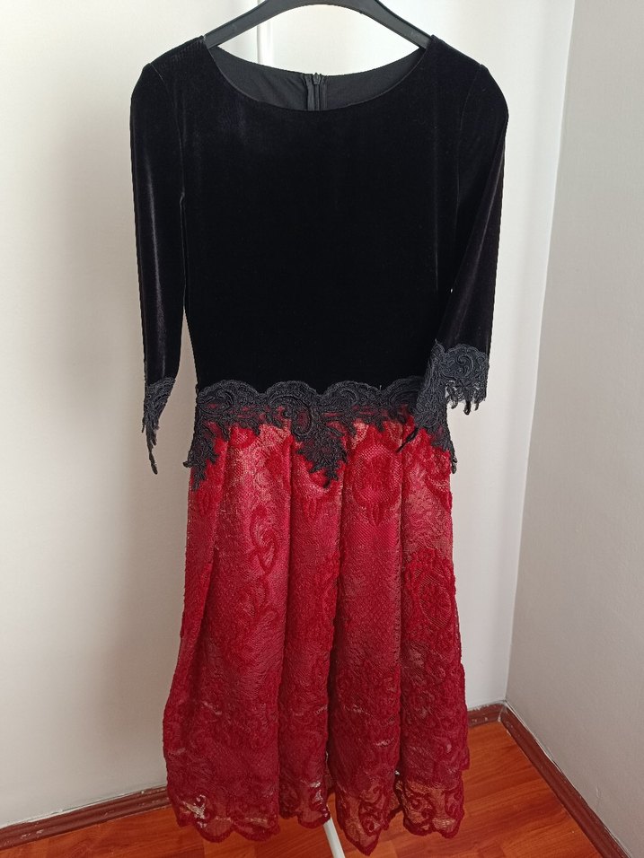 Kol uçları ve beli siyah dantelli, eteği bordo katlı astar ve üzeri dantel kumaş, üst kısmı siyah kadife elbise, 36 bedene uygundur, sıfır gibidir. Omuzdan itibaren yaklaşık 110 cm dir.