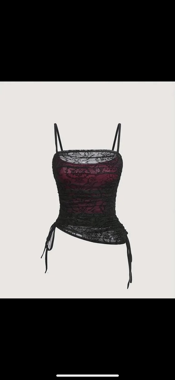 Bordo renkte, siyah dantel detaylı, ince askılı, halter yaka ve vücuda oturan gotik stilde bustiyer. Partiler için uygun, sentetik kumaş.