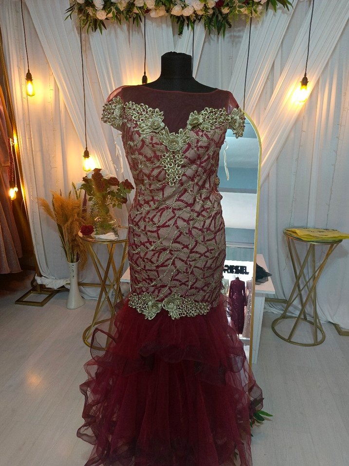 Bordo renkli, straplez ve kolsuz uzun abiye elbise, renkli işlemeli dantel detayları ve vücuda oturan kesimiyle dikkat çekiyor.