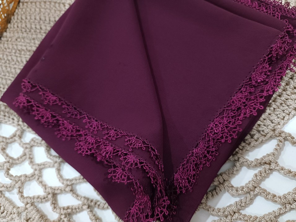 Bordo renkli kadın şal, ince dantel işlemeleri ve yumuşak sentetik kumaşıyla sade ve rahat bir görünüm sunar.